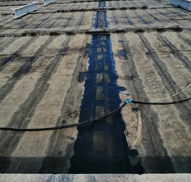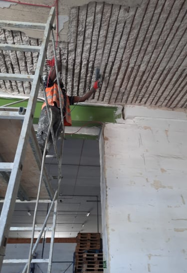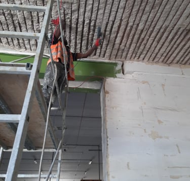 Structural repairs, roof waterproofing, gypsum and suspended ceilings, and internal partitions for industrial and commercial buildings, often as a preparation for rooftop PV systems.